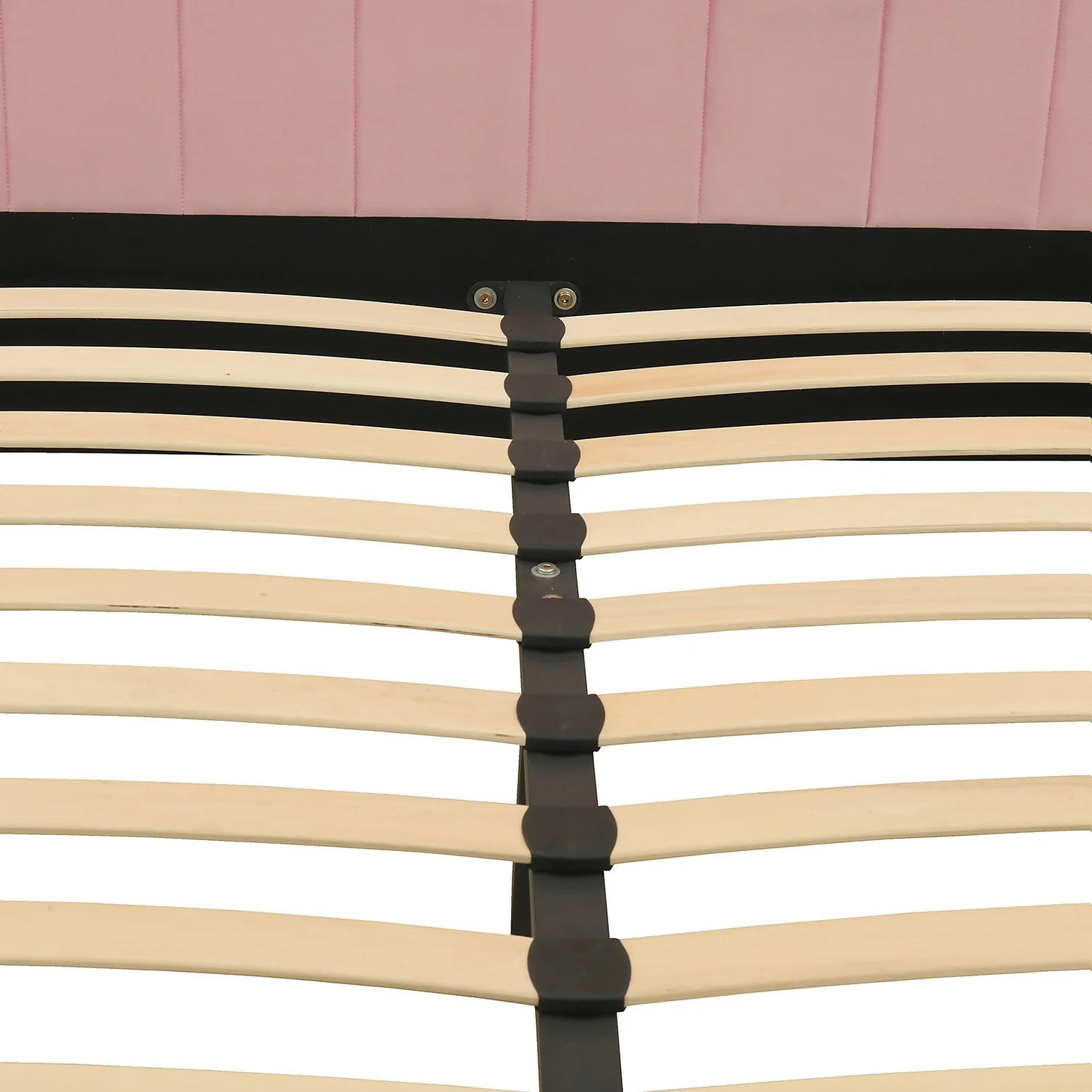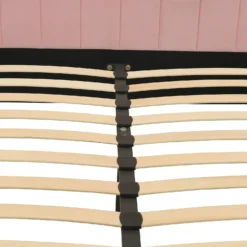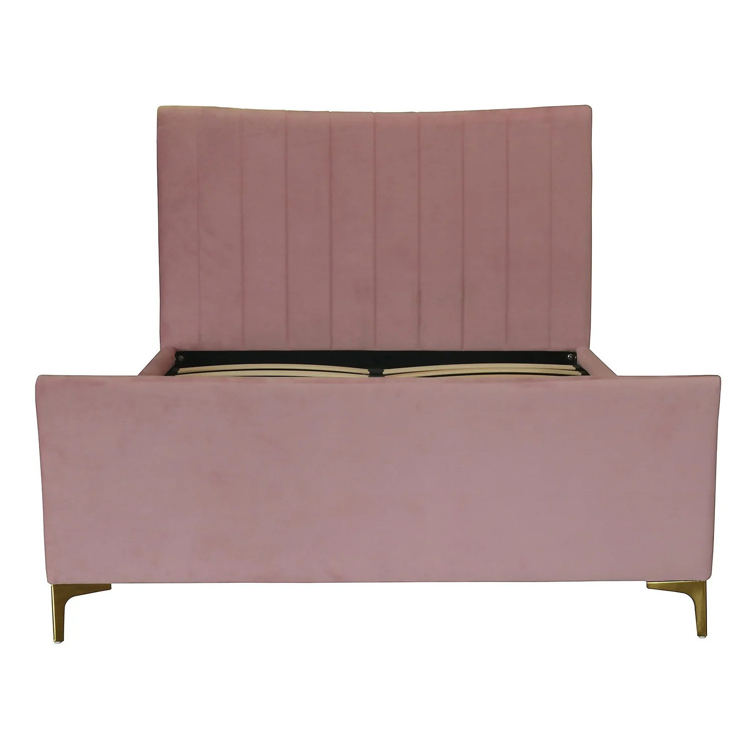 The headboard and frame have been upholstered in a soft, velvet material and the stitched line detailing on the headboard makes a bold statement. For the finishing touch, the gold effect metal legs that support this bed lend a dramatic flair.