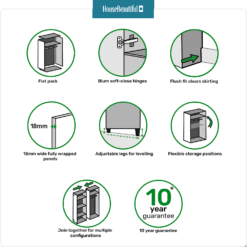 The House Beautiful range is exclusive to Homebase and offers a selection of different finishes and storage configurations to suit your needs. With a range of carcass colours and contrasting door designs, you can select the look to fit your bedroom aesthetic. The House Beautiful range now includes the fully fitted look with this combination pack which includes the wardrobe, end panels, plinth and cornice, meaning you can complete your bedroom with a luxury look. Coordinating chests of drawers are also available separately. This triple wardrobe (1 x double unit and 1 x single unit) features a grey internal carcass and includes end panels, plinth and matching cornice all in a finish to match the beautiful luxe gloss white slab doors. The wardrobe features premium soft close clip-on Blum hinges, two shelves and two hanging rails. You can customise your wardrobe with our additional internal storage options (available separately) including internal drawers, shelves, dividing shelves and extra hanging rails. Choose your handles from our range of both traditional and modern to suit your desired look.