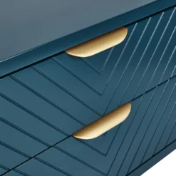 The stylish 2 drawer Trixie bedside table features accent chevron patterns, while a deep moody blue finish and gold drawer pulls and base combine to give this piece a luscious contemporary feel.