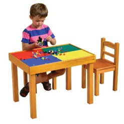 Multi-purpose, durable design with removable/reversible top. Under the removable/reversible top (blackboard/whiteboard) there?s a construction board surface. Board takes all popular brands (Lego/Duplo/Megabloks etc). With cover on, the large flat tabletop is perfect for drawing, painting, picnicing or reading at!