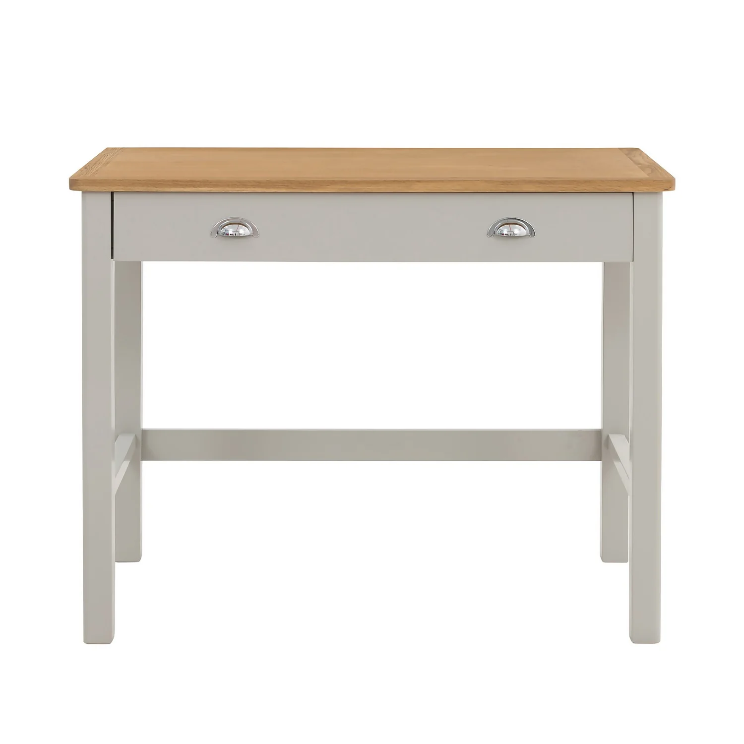 We’ve worked hard to make Norbury our most family-friendly range yet. We’ve softened all the edges, even the legs, so there are no sharp corners here. This compact collection has a small footprint. Meet our oak Norbury desk table. With its classic oak finish and cup handles, it has a charming timeless design. The top is deep enough to fit larger sized monitors and there is ample space for a keyboard or laptop. The wide drawer makes taking care of paperwork that bit easier. Whether this is your home office desk or a place to study, create a workspace you’re happy to spend time in with Norbury.