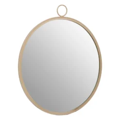 This wall mirror has round gold finish frame with clean contours bending around the centre mirror. The decorative ring at the top gives this mirror a modern look popular with interior designers.